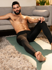 Dark-haire hunkl Billy Baval shows his sexy ripped body and pissing