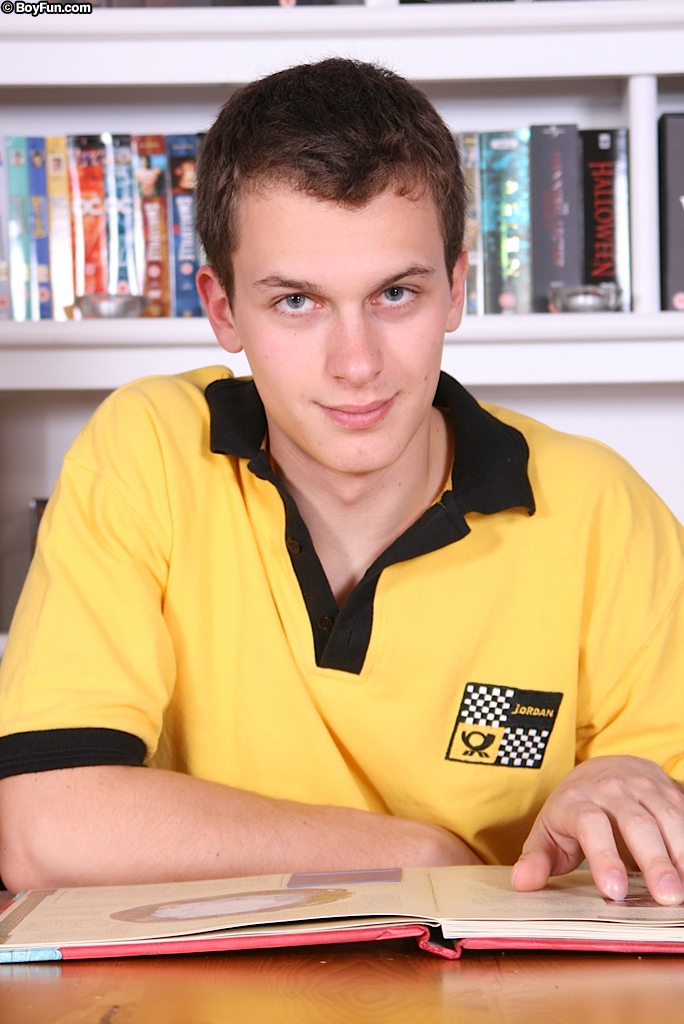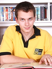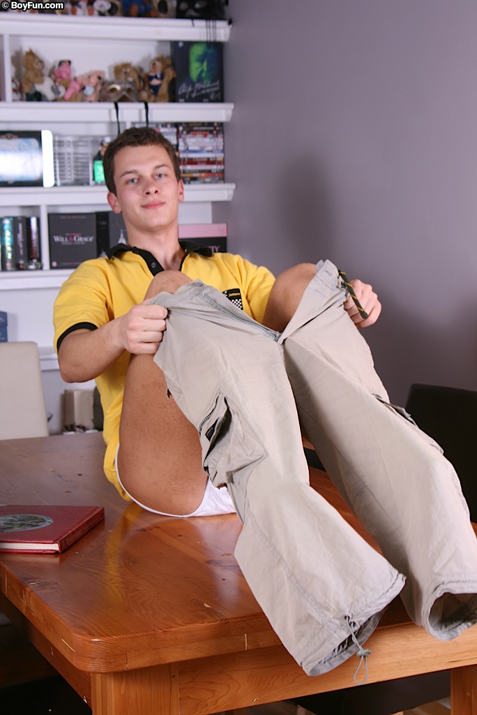 Cute twink Ricky strokes his cock on the dining room table.