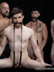 Two studly slaves gets tied up, used and abused by Christian Wilde during a live show.