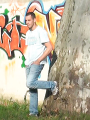 Cute twink Franky busts a big nut outdoors.