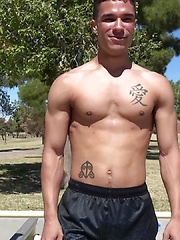 Good-looking gay hunk Jack Spade shows off his athletic body & tattoos