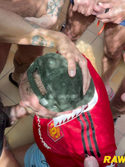 Corporate cunt gets his mouth and ass violated by a mob of horny men.