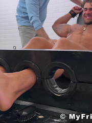Gay bondage slut takes a cock in his mouth then recieves a horny footjob