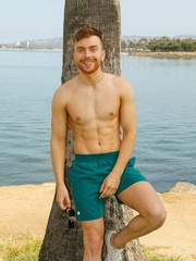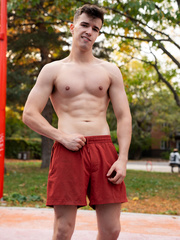 Handsome athlete Poax strips by the poolside