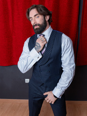 Dark-haire hunkl Billy Baval shows his sexy ripped body and pissing