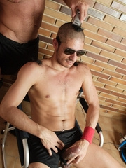 Dark-haire hunkl Billy Baval shows his sexy ripped body and pissing