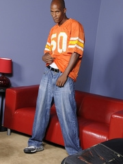 Ripped tall black dude Billy Long strips & shows his six pack and huge black dick