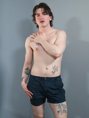 Dark-haire hunkl Billy Baval shows his sexy ripped body and pissing