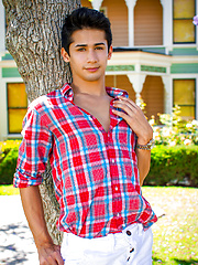 Beautiful curly twink Leo Animo playing with his huge uncut cock