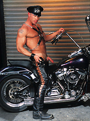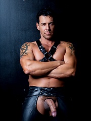 Muscle man in leather pants.